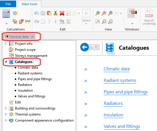 - Cataloghi - i cataloghi accessibili nel programma sono file pronti e immodificabili coi dati degli elementi che possono essere usati durante la progettazione degli impianti. Un tipo speciale di cataloghi sono dati climatici. Grazie ai file salvati nei cataloghi, non è necessario immettere vari dati particolari riguardanti gli elementi da usare nella progettazione; basta semplicemente indicare il prodotto od il sistema da usare nel progetto, invece il programma legge tutti i dati necessari dal catalogo.