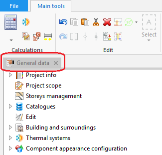 La prima tappa del lavoro è l'impostazione dei dati generali e la verifica di setting predefiniti, che sono dati di base comuni per tutto il progetto. Questi dati possono essere modificati ad ogni momento della creazione di un progetto. La finestra Dati generali è accessibile nel listino finestre localizzato sulla barra degli strumenti. Informazioni dettagliate sullo scopo dei Dati generali da modificare, a seconda del tipo d'impianto progettato o a seconda del tipo di calcoli condotti, si trovano negli articoli descriventi particolari usi del pacchetto - vedi:USI.