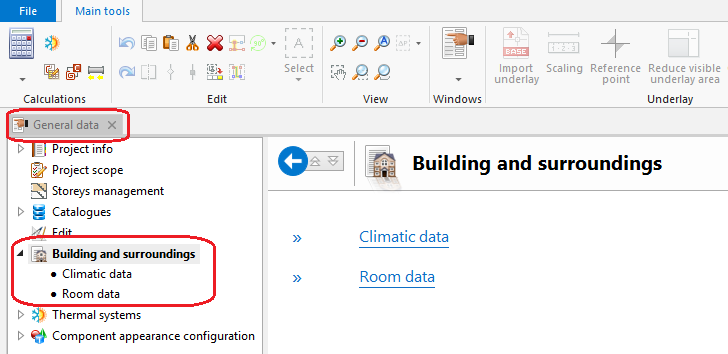In questo luogo dei dati generali è possibile definire in modo individuale l'insieme dei cataloghi che devono essere accessibili durante la modifica degli impianti e durante la scelta degli elementi come pure durante i calcoli. A seconda della configurazione del pacchetto, saranno accessibili vari tipi e vari scopi dei cataloghi. Quelli ultimi possono essere un insieme dei dati di elementi neutrali o degli elementi di un produttore specifico. - Dati dell'edificio -permettono di definire le informazioni di base di un dato edificio nell'ambito degli impianti progettati.