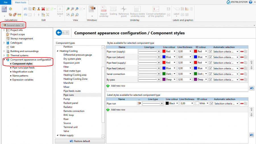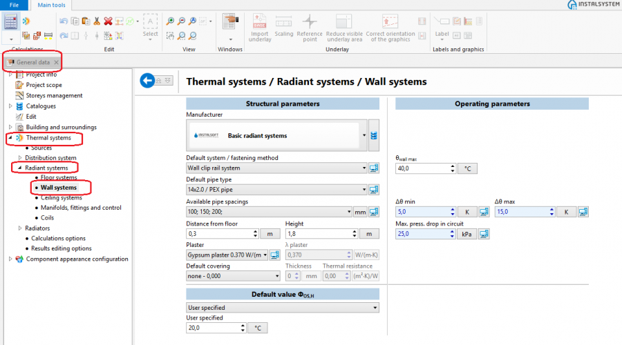 Piani permettono di definire o modificare la struttura dell'edificio (numero e le informazioni di base sul piano). Per ogni piano viene creato automaticamente un foglio per poter lavorare sulla vista in piano di questo piano. - Dati predefiniti degli impianti progettati - sono dati supportati per tutti gli elementi di un impainto che hanno in un dato campo di dati lo status predefinito (simbolo di un computer). Tale status possiedono gli elementi recentemente inseriti. Ad ogni fase del lavoro è possibile il cambiamento del valore predefinito - è possibile immettere, ai particolari elementi del progetto, dati specifici oppure tornare all'impostazione predefinito. Dati predefiniti sono accessibili nella finestra Dati generali in quanto alcuni set separati, ad es. Impianti di riscaldamento.
