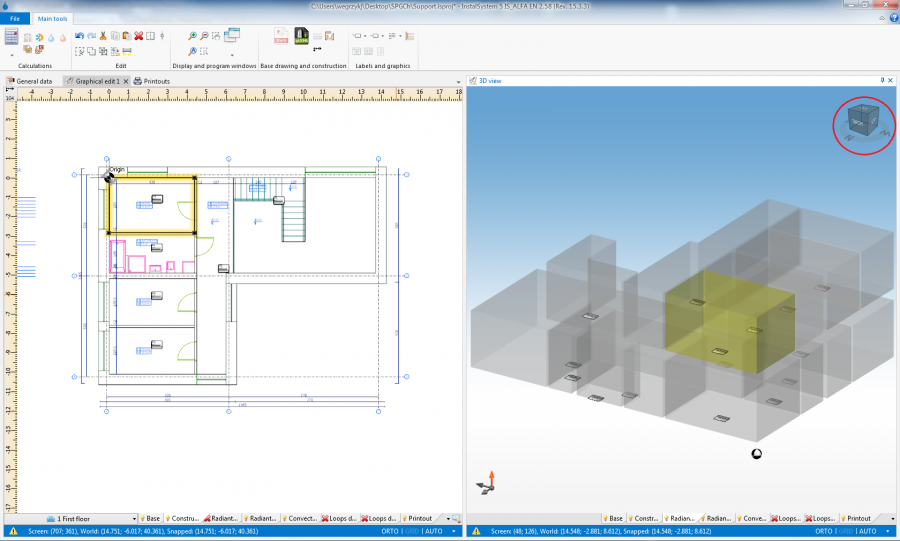 - Lo strumento che permette di adoperare una verifica visuale della correttezza della struttura dell'impianto è, come nella verifica della struttura dell'edificio descritta sopra, la vista 3D del progetto. La vista 3D può essere accesa tutto il tempo, il che abilita la verifica della correttezza della struttura dell'impianto durante la sua edizione. In questo caso vale la pena lavorare con due File:Installation-project.png24. Struttura dell'impianto