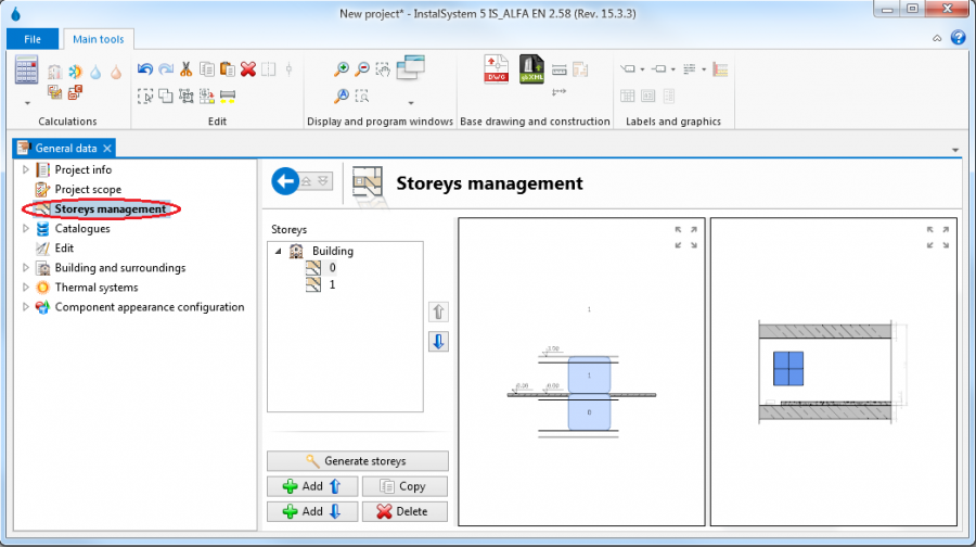 La struttura dell'edificio costituisce la base su cui è possibile la creazione dell'impianto. L'edificio può essere composto di più piani. Per ogni piano il programma crea un foglio di disegno separato in quanto vista in piano su cui possono essere modificati gli elementi della struttura dell'edificio che appartengono ad un dato piano e gli elementi degli impianti progettati su questo piano. La modifica di particolari scopi si svolge su fogli separati (layer), mentre tutto l'edificio e tutti gli impianti ivi progettati creano un progetto integrato e unico.